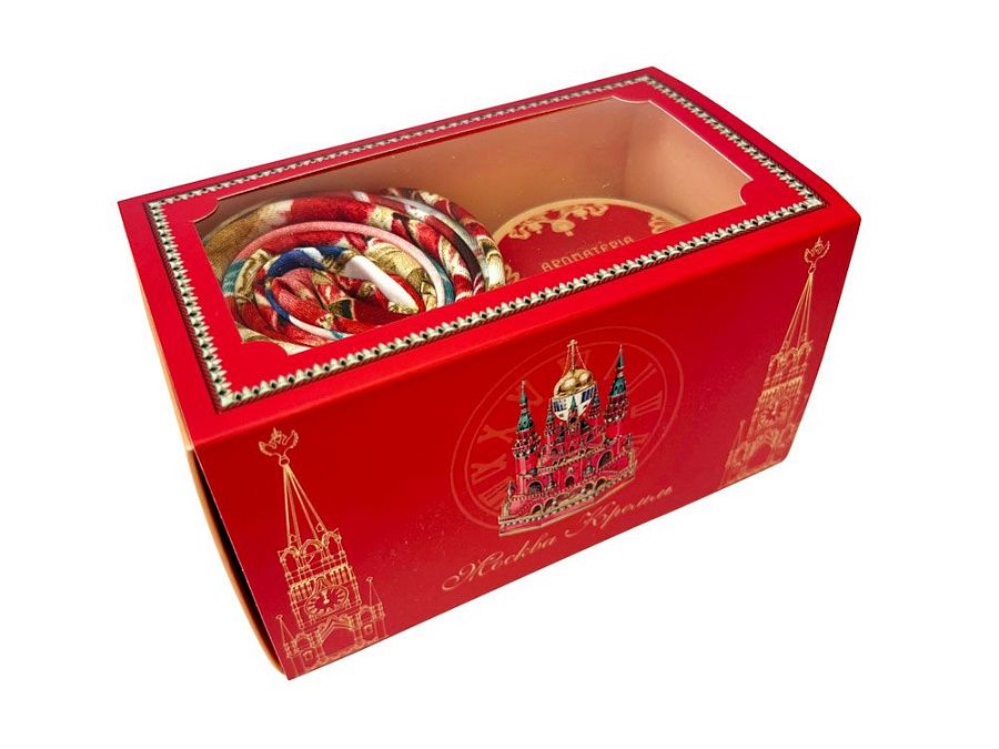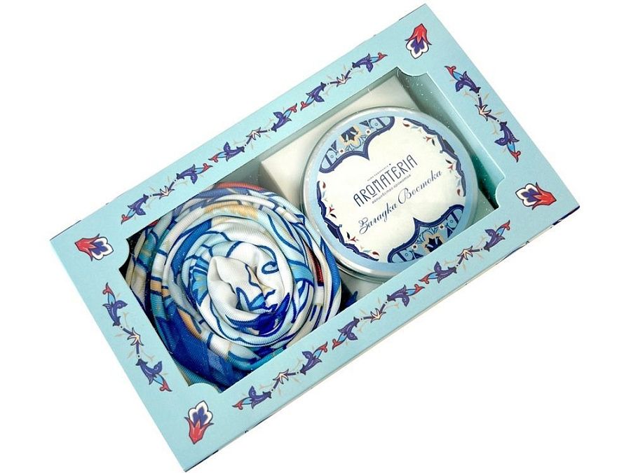 15 х 8,5 х 8,5 см, платок 90 х 90 см, свеча d6,5 х 5