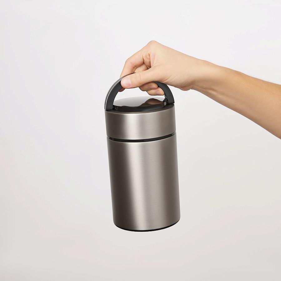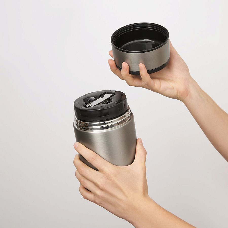 Внутренняя крышка оснащена специальным отсеком, в котором находится складная ложка из высококачественной стали 304 марки. Вакуумная конструкция из нержавеющей стали надежно сохраняет тепло.
