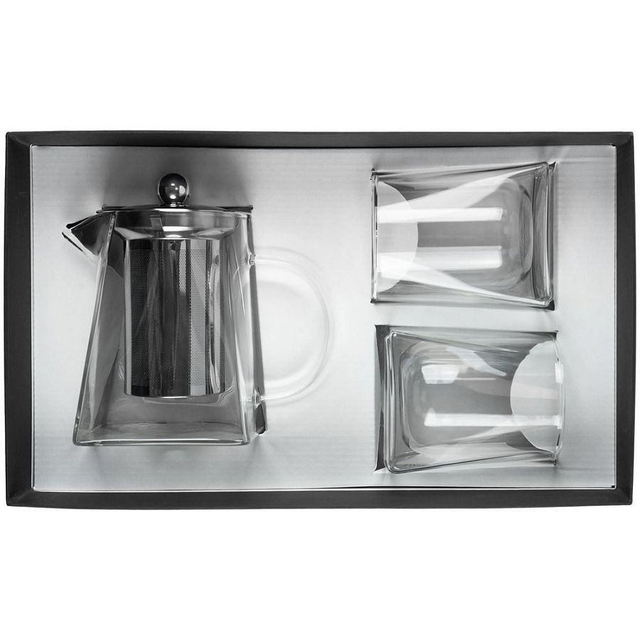 чайник, стаканы - боросиликатное стекло; крышка и сито - нержавеющая сталь; коробка - переплетный картон