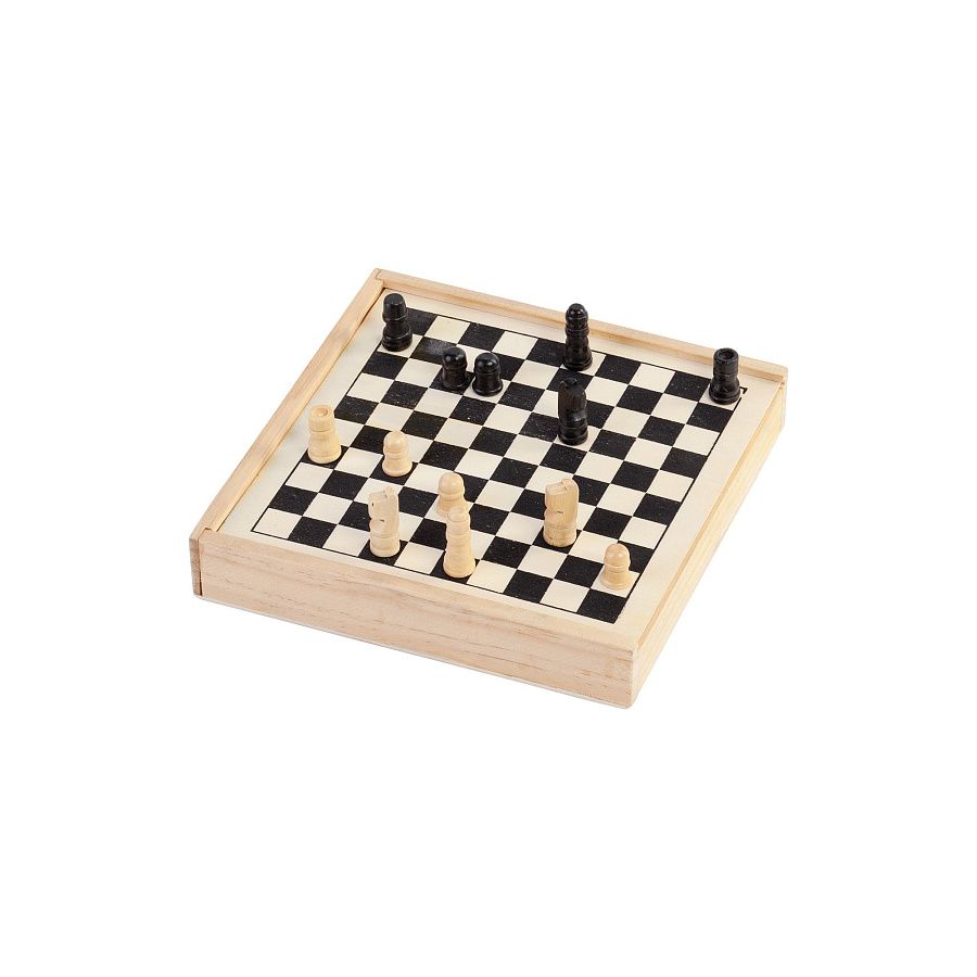 Игровое поле для шахмат и шашек нанесено прямо на выдвижную крышку футляра, обратная сторона остается чистой.