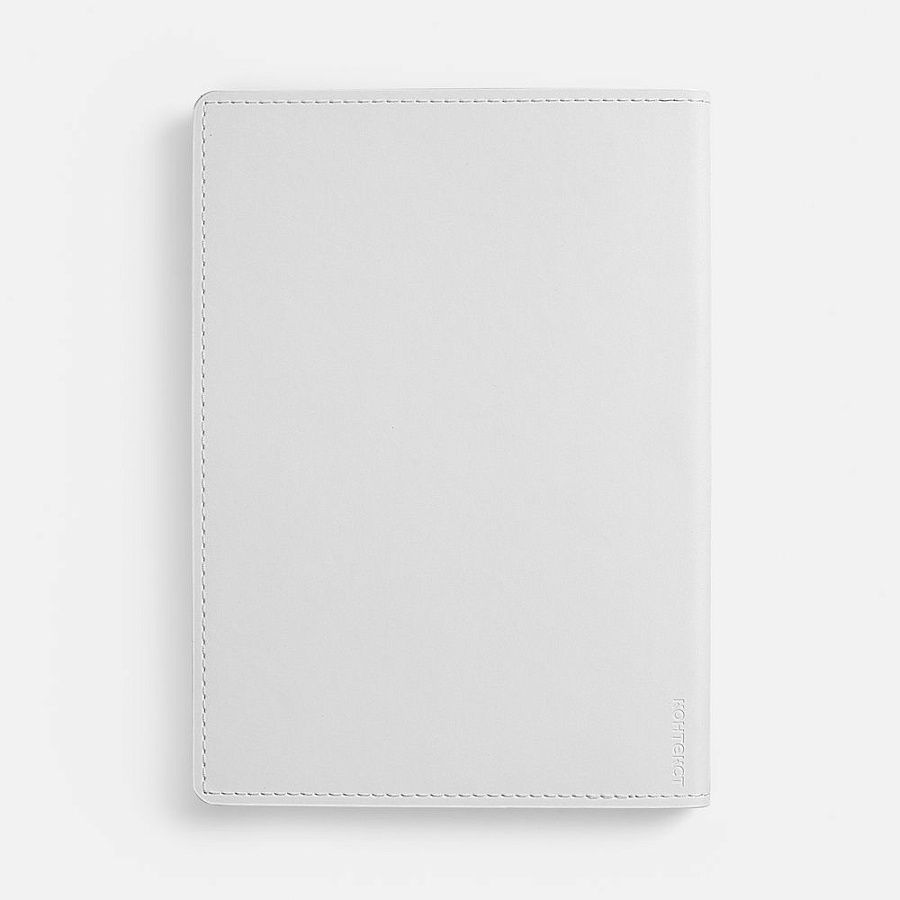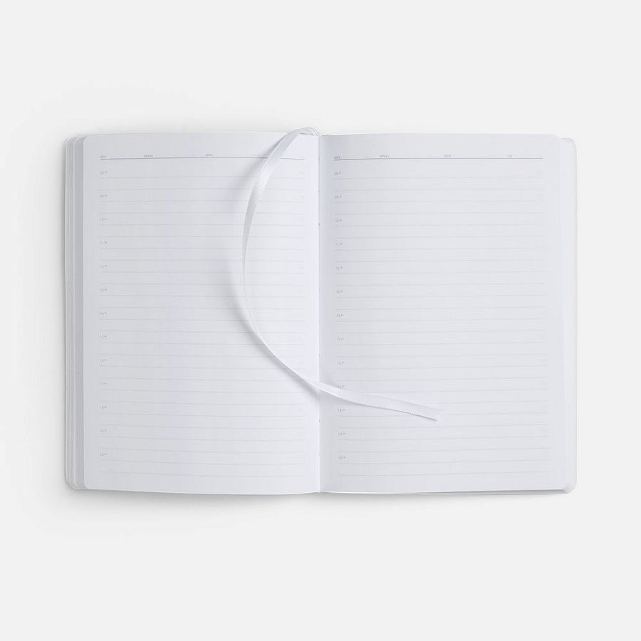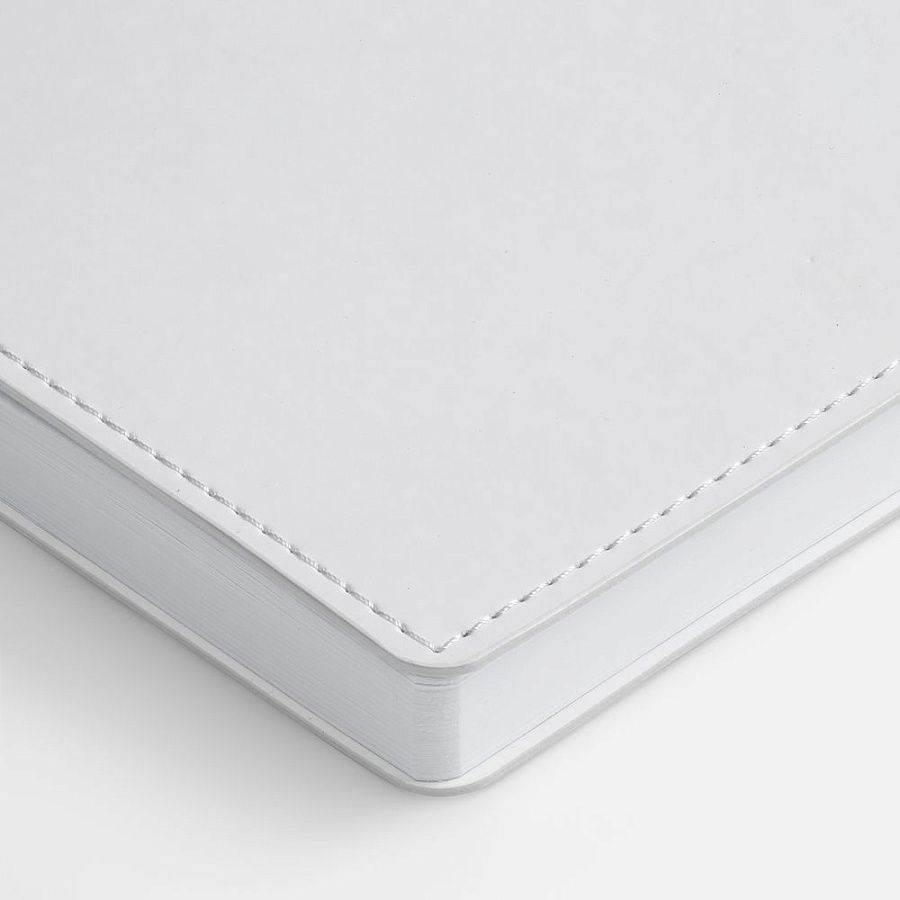 Ежедневник с гибкой обложкой из материала Soft Touch, белый BB, дополнен петелькой из покровного материала для ручки, капталом, ляссе и закрашенным срезом обложки в цвет материала.