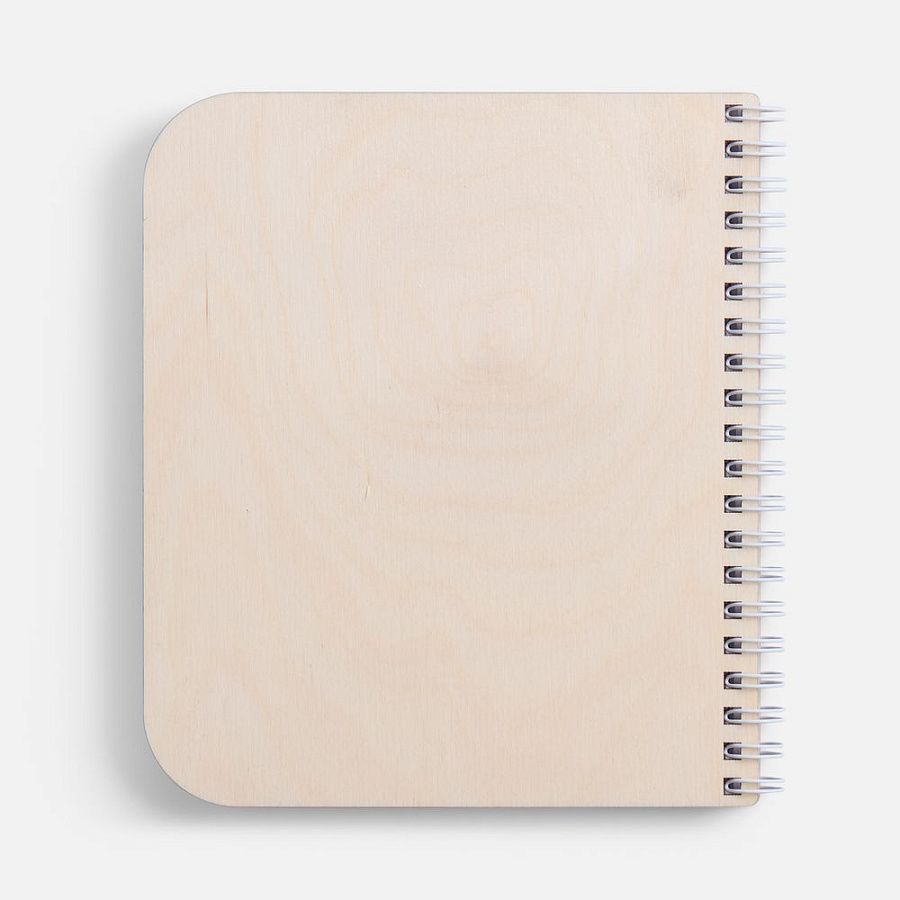 Блокнот на пружине Woodpad с деревянной обложкой. Входящая в комплект ручка крепится к нижней обложке резинкой.
