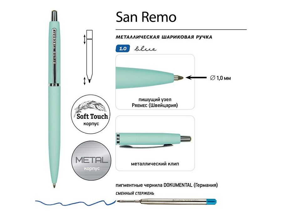 Как и все подарочные ручки «Bruno Visconti», «San Remo» - обладательница стержня с пишущим узлом от швейцарского производителя Premec и перманентными чернилами немецкого производителя Dokumental. Поэтому можно быть абсолютно уверенным в качестве письма.