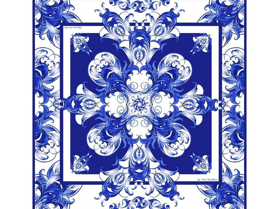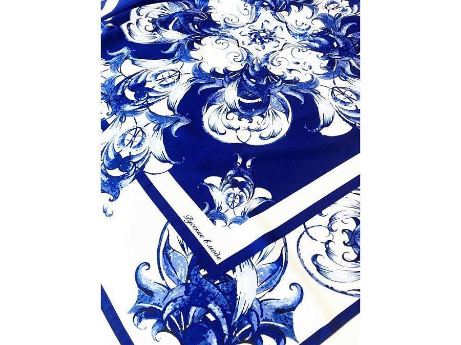 Платок «Кремль – Москва» в шелке воплощает шедевр ювелирного искусства Карла Фаберже из серии подарков для русской императорской семьи. В центре полотна расположен Успенский собор в обрамлении башен Московского Кремля. Утонченный рисунок, яркое цветовое решение и глубокий символизм дизайна платка созданы для эффектного акцента праздничного образа.