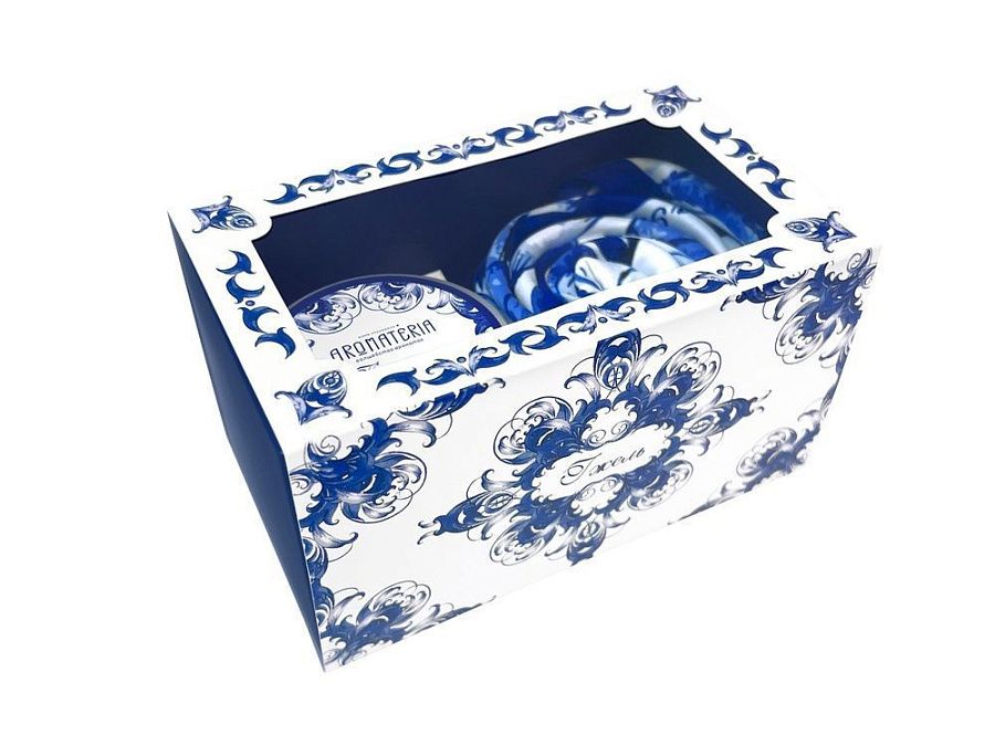 15 х 8,5 х 8,5 см, платок 90 х 90 см, свеча d6,5 х 5