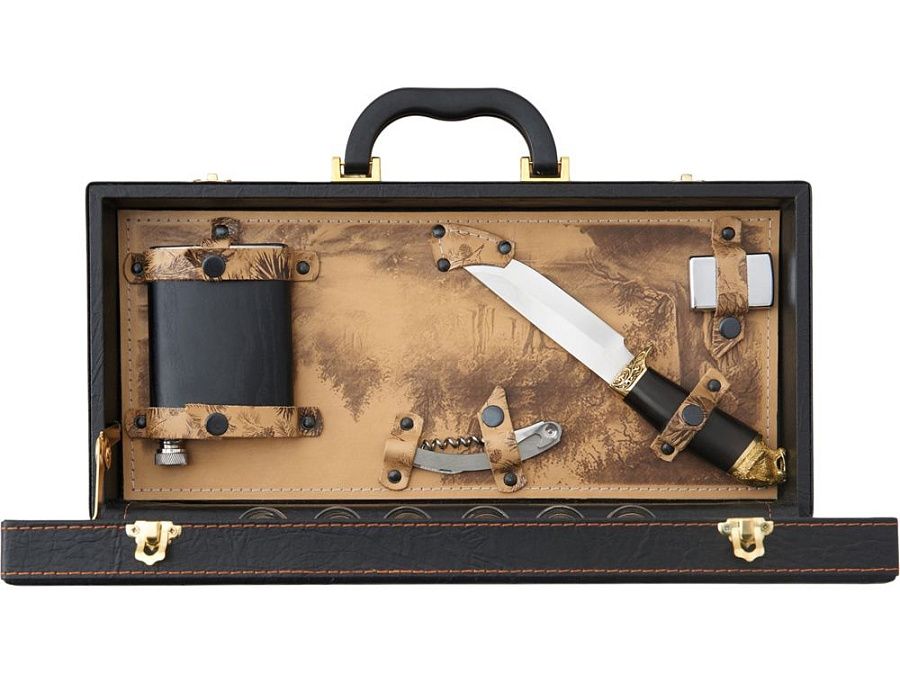 Все аксессуары упакованы в кейс из сплит-кожи, внутренняя отделка натуральная кожа с художественным выжиганием. Каждое изделие уникально, так как художественное выжигание может отличаться от представленного на фото, что придаёт набору особую индивидуальность. Все аксессуары надежно крепятся к кейсу кожаными ремешками на кнопке, обеспечивая удобство транспортировки и сохранность содержимого.