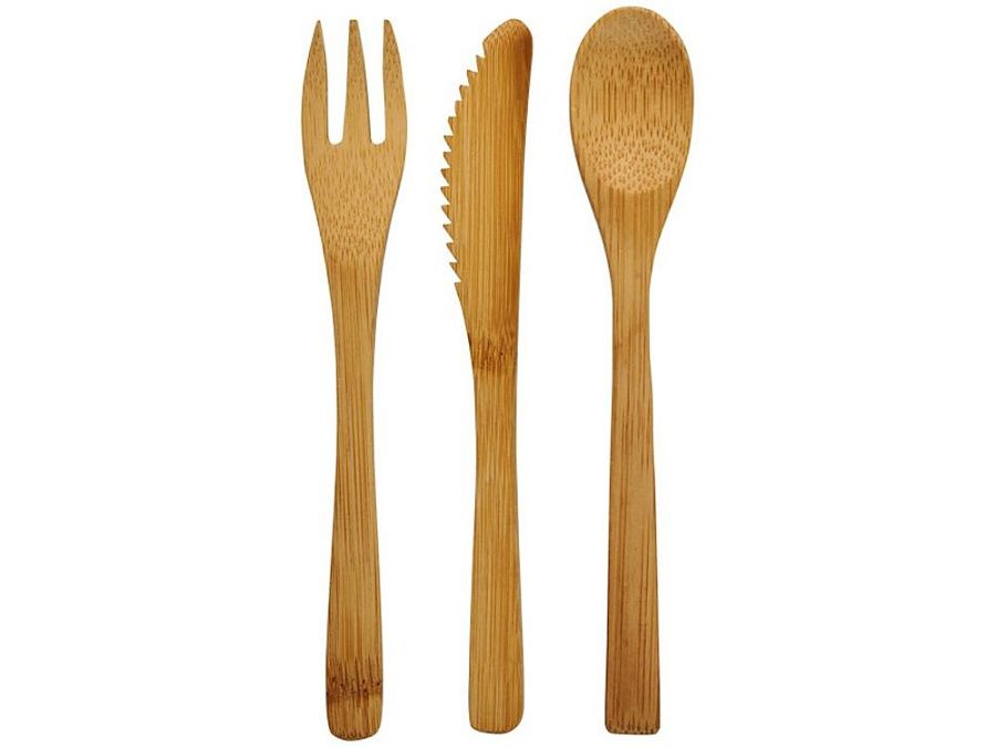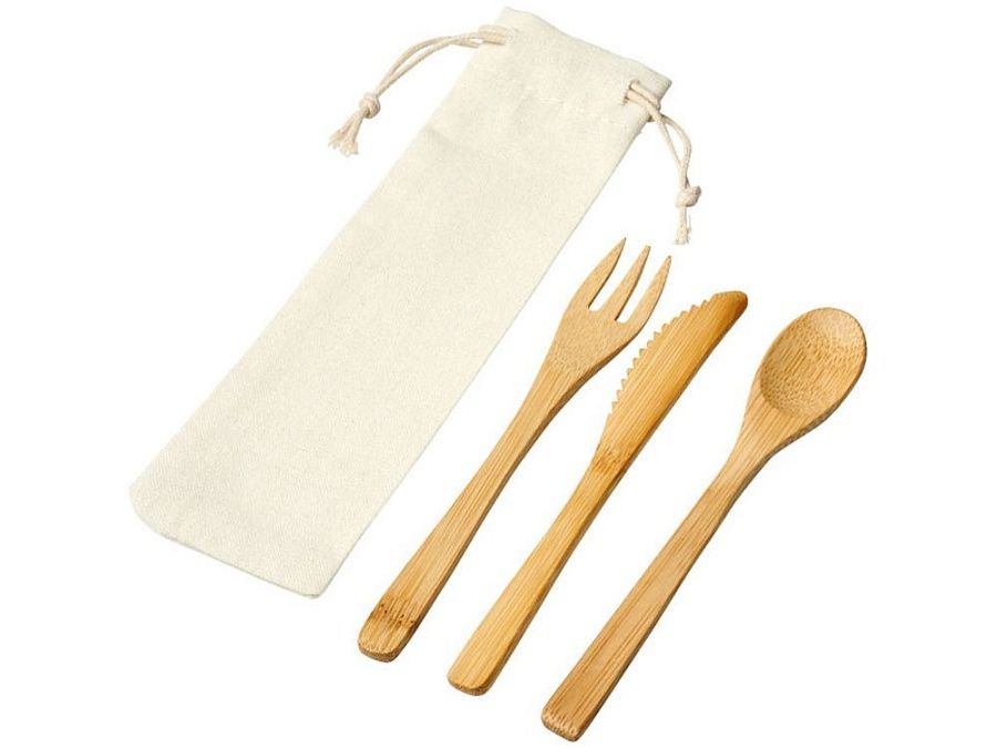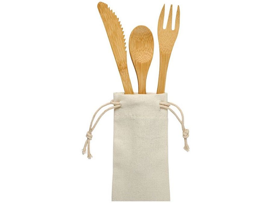 Набор столовых приборов Celuk из бамбука. Набор столовых приборов из бамбука состоит из вилки, ножа и ложки. Поставляется в нетканом мешочке. Бамбук.