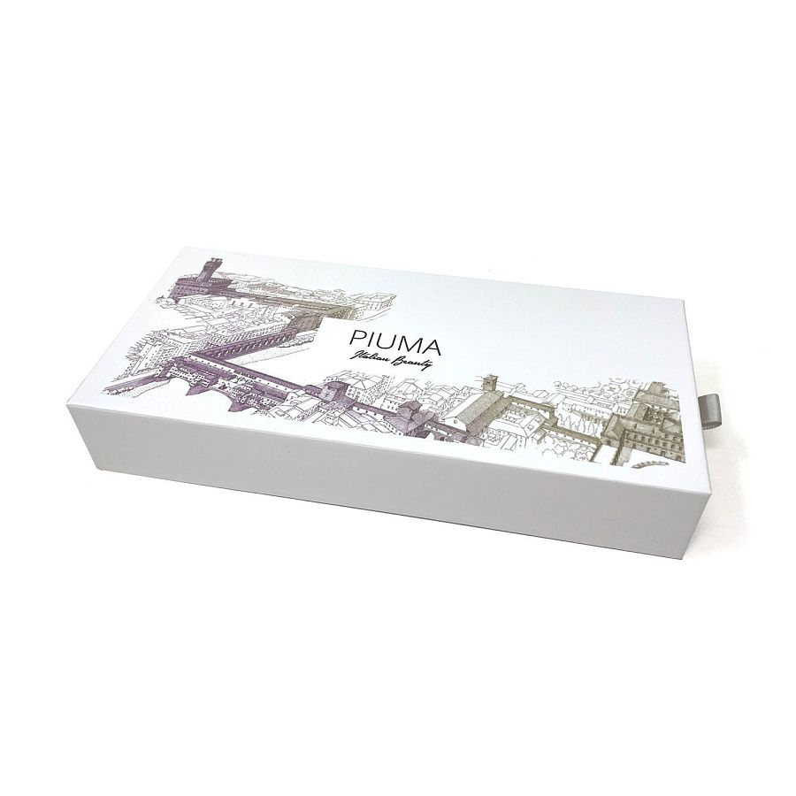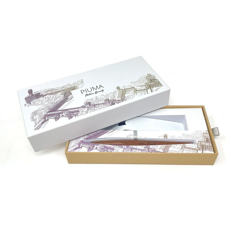 Вечная ручка Pininfarina Piuma Флоренция из лимитированной коллекции дизайнеров Pininfarina в сотрудничестве с Francesco Corni Foundation, посвященной красоте Италии и представленной 8 городами. Франческо Корни - выдающийся дизайнер из Модены, посвятивший свою жизнь популяризации истории и архитектуры. Используя трехмерное перспективное видение, он изучает наиболее значимые здания каждого города, выбирает наилучшую точку обзора, чтобы подчеркнуть их особенности, и прорисовывает детали в древней технике калиграфии. Дополняет видение мастера умелое использование цветов, по одному для каждого города. Для Флоренции дизайнер выбрал центром композиции Corridoio Vasariano, идущий от Palazzo Vecchio до Palazzo Pitti, и фиолетовый цвет, в результате подарочная коробка c ручкой Pininfarina PIUMA становится произведением искусства. PIUMA - ручка динамической формы в виде гусиного пера. Дизайнеры вдохновлялись Кодексом о полете птиц мастера Леонардо да Винчи, целью которого было понять тайну полета и который хранится сейчас в Королевской библиотеке Турина. Piuma находится в постоянном равновесии со своим центром тяжести благодаря белому стальному пьедесталу. Вечная ручка имеет необычный пишущий узел в виде наконечника Ethergraf®, изготовленного из сплава металлов по запатентованной технологии. Он не содержит свинец и алюминий, производится вручную итальянскими мастерами и практически не расходуется за десятилетия использования. При соприкосновении с поверхностью бумаги, происходит химическая реакция и наконечник оставляет серебристый след, который напоминает цвет графитового карандаша, но обладает большей стойкостью. Идеально пишет на каменной бумаге. На ручке стильный логотип Italian Beauty, она полностью сделана из дерева груши. Набор упакован в белую подарочную коробку.