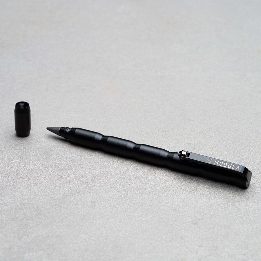 Ручка-трансформер из коллекции Pininfarina Modula черного цвета создана Pininfarina в сотрудничестве с итальянским дизайнером Луиджи Тренти. Получился совершенно необычный пишущий инструмент, сочетающий в себе шариковую ручку и карандаш. Корпус сделан из алюминия и имеет два независимых пишущих узла: шариковую ручку и карандаш со сменным наконечником из материала GrafeeX. GrafeeX - это запатентованный инновационный материал, полученный в результате спекания мелких частиц графита при высоких температурах. То есть он пишет, как обычный графитовый карандаш, но из-за высокой плотности материала крайне экономно расходуется, и его хватает очень надолго. Modula - это своеобразный конструктор, так как она может быть составлена по-разному, вплоть до укорачивания, вследствие того, что один из двух наконечников можно убрать. Оригинальный дизайн клипа. Длина ручки 15 см, диаметр 0,6 см, вес 22 гр. Упакована в черную коробку из дизайнерского многослойного картона 15х3,5х2 см. Вес в упаковке 62 гр. Сделана в Италии.