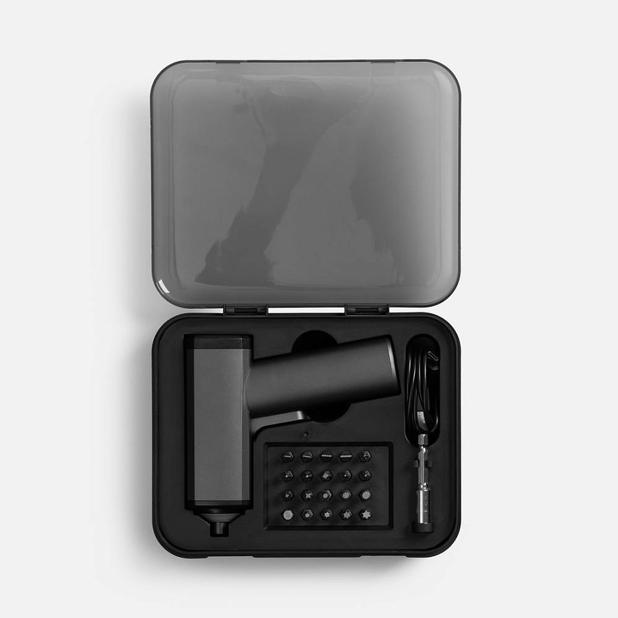 Отвертка оснащена LED-подсветкой, что особенно удобно при работе в плохо освещенных местах, например, под столом или в углу шкафа. Комплект включает все необходимое: набор из 20 насадок под разные типы винтов, удлинитель и аккуратный кейс для хранения: все можно хранить в идеальном порядке и всегда иметь под рукой.