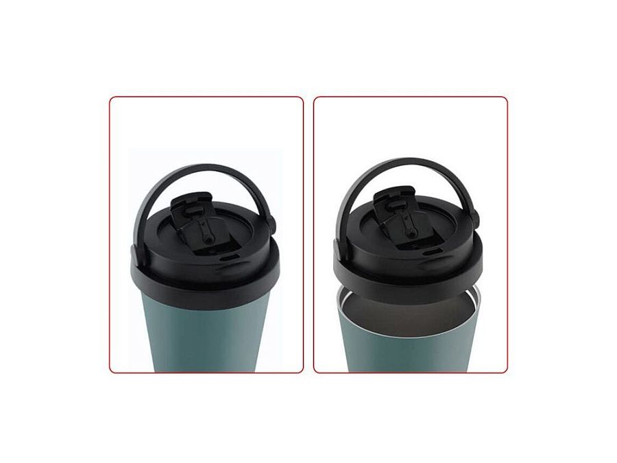 Термоизоляция защищает корпус от нагрева при хранении горячих напитков и от появления конденсата от холодных. Поэтому термостакан безопасно держать в руках и ставить на любые поверхности. Такой термопосуде не нужна традиционная ручка, но для удобства переноски предусмотрена поворотная ручка на крышке. В сложенном виде она интегрируется в плоскость крышки, плотно фиксируется за счет специального выступа и не мешает при питье. В процессе выпивания напитка крышку можно не снимать – в её конструкции предусмотрен откидной клапан, который легко открывается и закрывается одной рукой. Он защищает напиток от попадания пыли внутрь, а также минимизирует влияние температуры окружающей среды, способствуя сохранению напитка горячим или холодным длительное время. В положении «открыто» клапан плотно фиксируется в плоскости крышки и не опрокидывается при питье. В крышке предусмотрены два отверстия – питьевое и воздушное для обеспечения плавного потока жидкости.