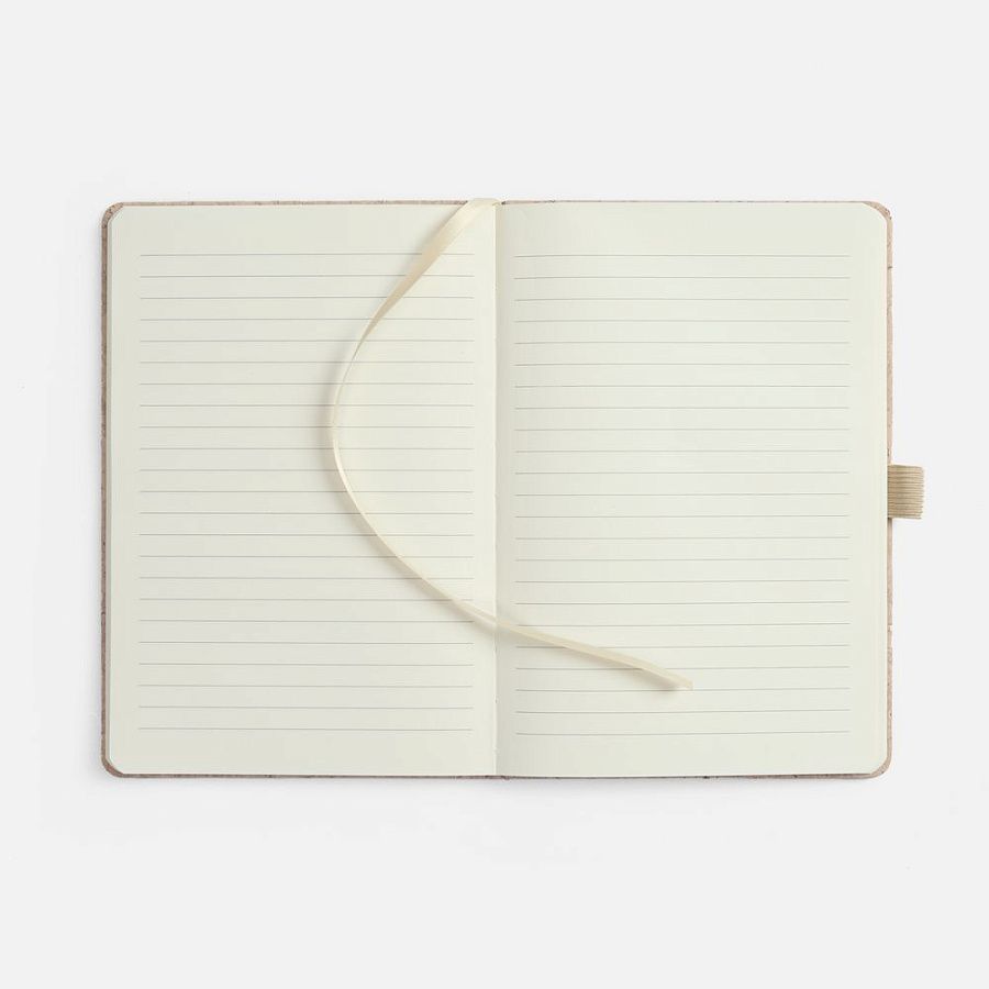 Блокнот с твердой обложкой из натуральной окрашенной пробки, дополнен петлей-резинкой для ручки, ляссе и резинкой в цвет обложки.