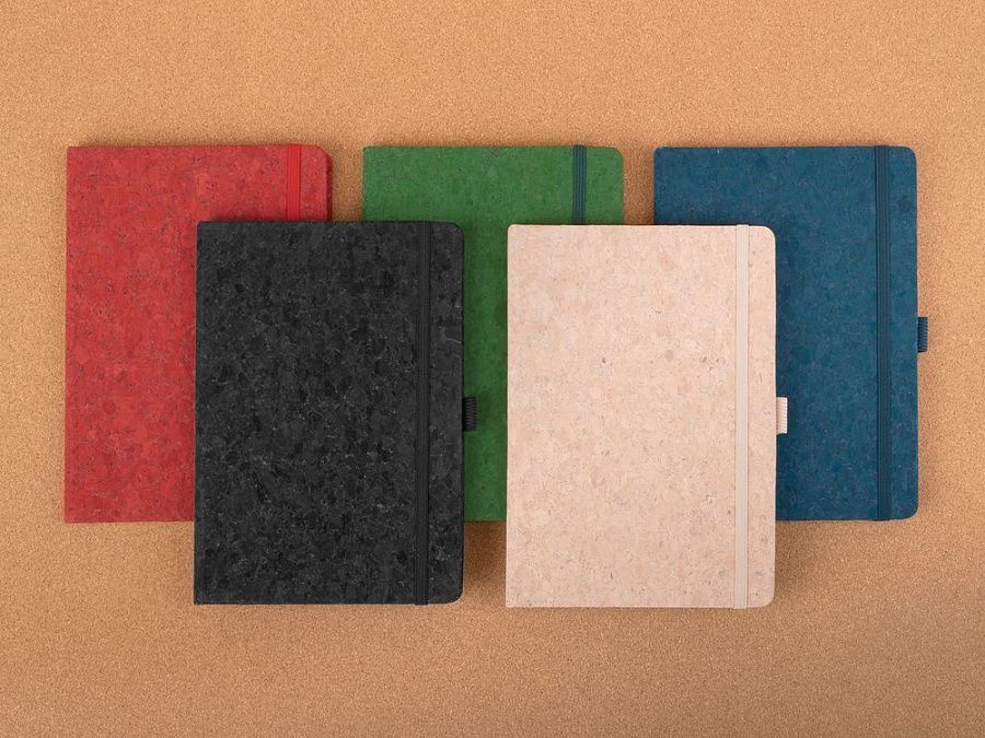 Блокнот с твердой обложкой из натуральной окрашенной пробки, дополнен петлей-резинкой для ручки, ляссе и резинкой в цвет обложки.