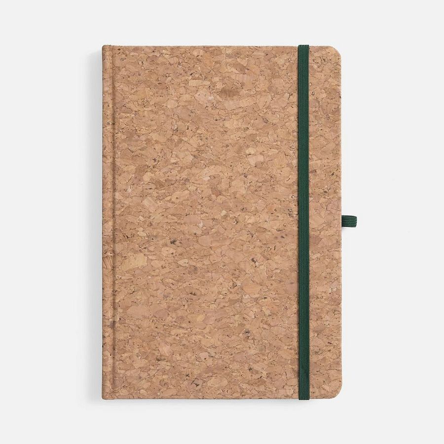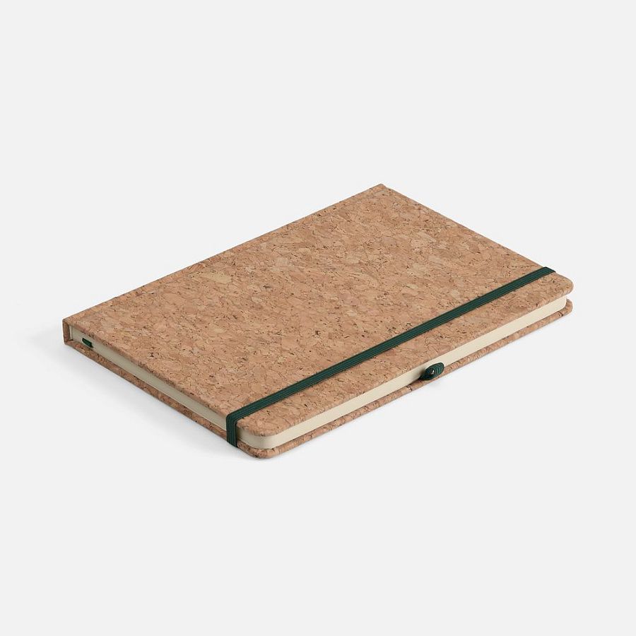 Блокнот в твердой обложке из натуральной неокрашенной пробки, дополнен цветными петлей-резинкой для ручки, ляссе и резинкой на обложку.