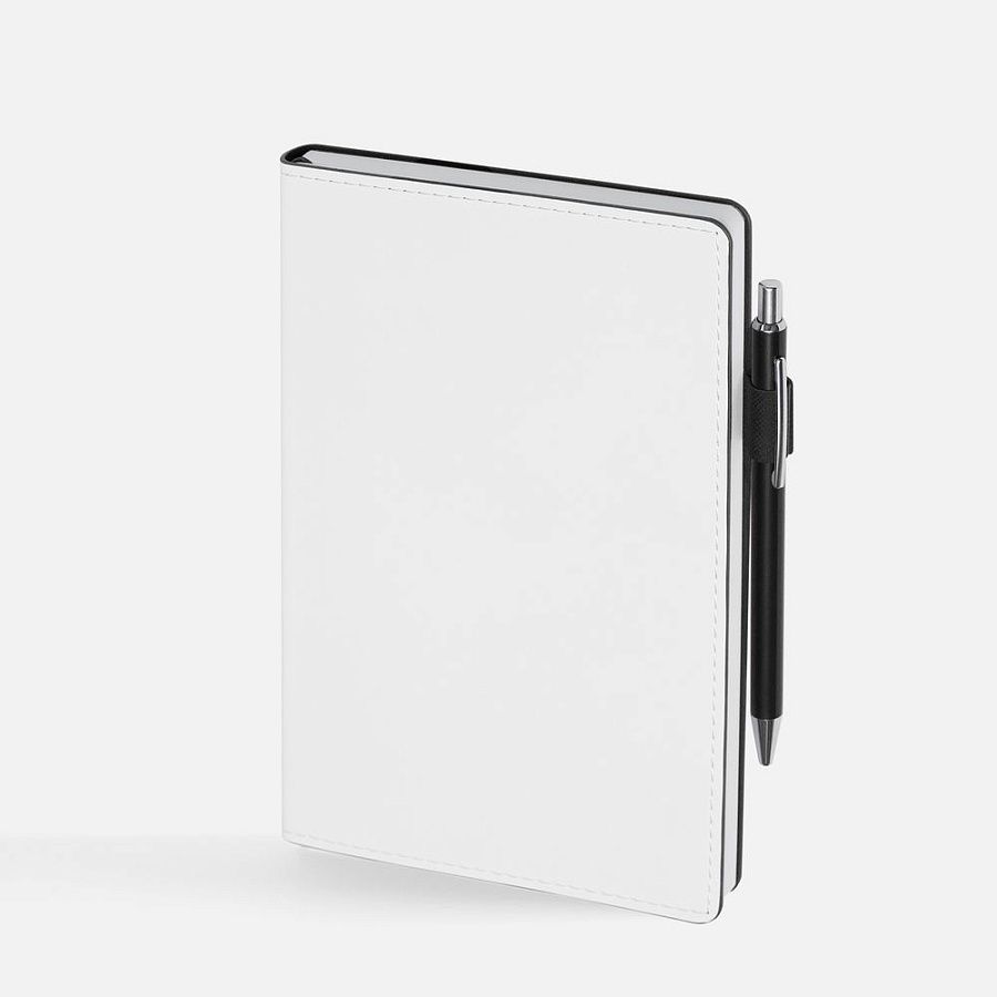 Гибкая обложка, материал обложки — Soft Touch, белый BB и Latte, черный АА; материал петли для ручки — Nice Touch, черный АА. Срез обложки окрашен в черный цвет.