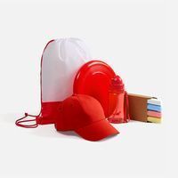 картон; бутылка, тарелка - пластик; бейсболка - хлопок 100%, плотность 260 г/м²; рюкзак - полиэстер 100%, 210d