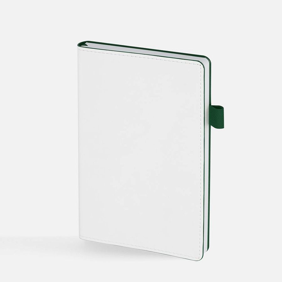 Гибкая обложка, материал обложки — Soft Touch, белый BB и Latte, зеленый FF; материал петли для ручки — Nice Touch, зеленый FF. Срез обложки окрашен в зеленый цвет.