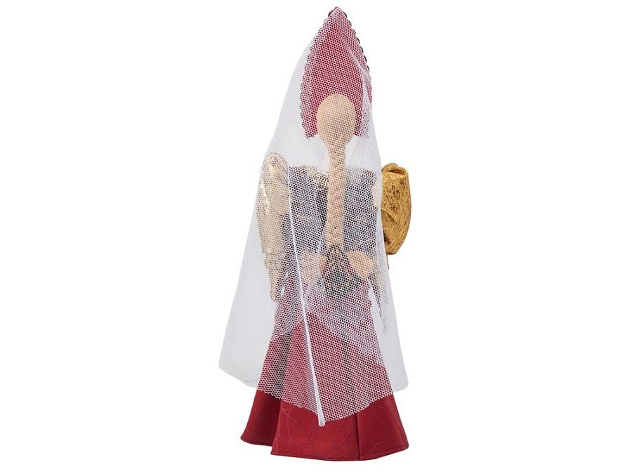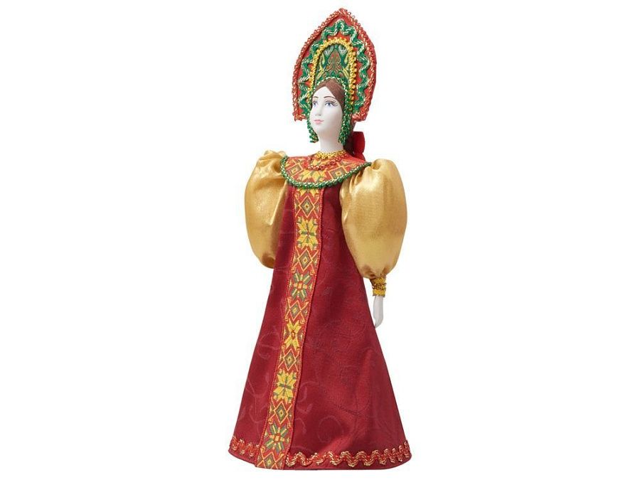 - Фарфоровая кукла в народном костюме ручной работы: алый сарафан с пышными рукавами и расшитый кокошник создают образ русской красавицы в праздничном наряде.