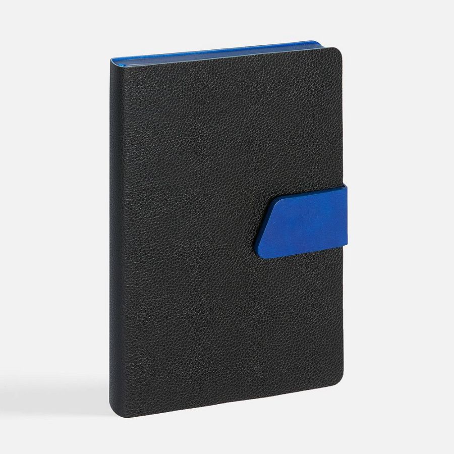 Ежедневник с гибкой обложкой, выполнен из материала La Fite, черный АА и Nubuck Touch, синий, дополнен синим ляссе и хлястиком на кнопке.