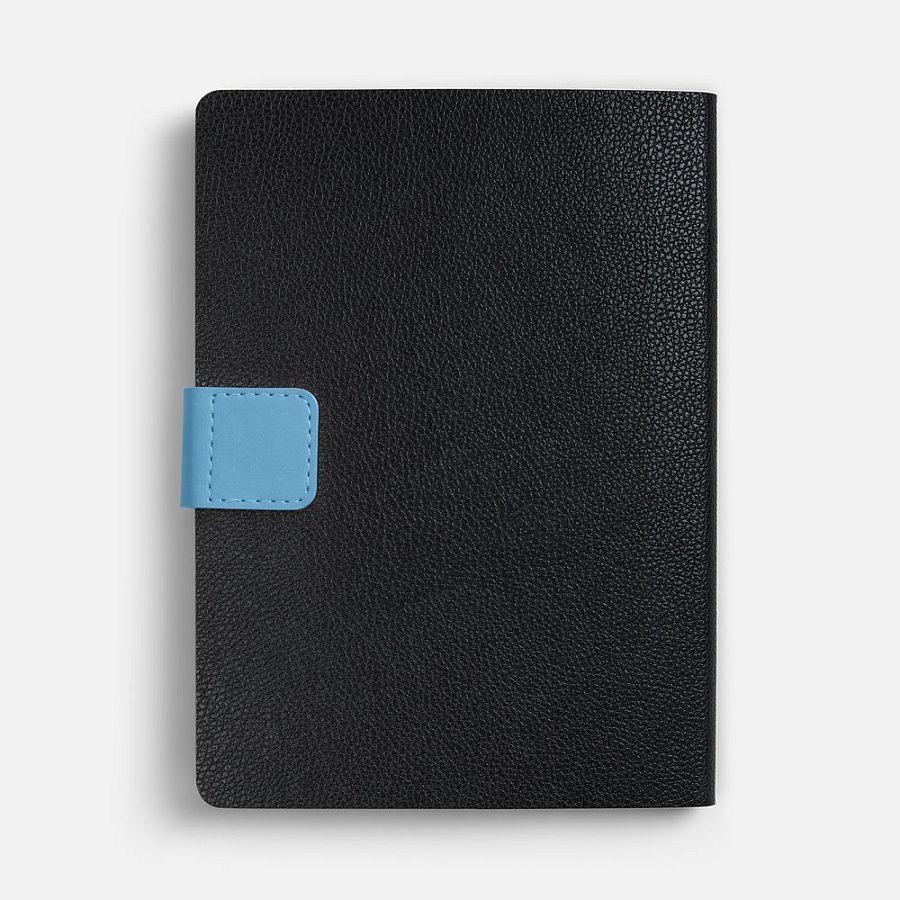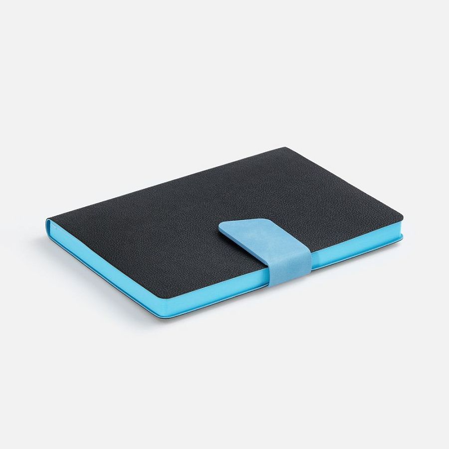 Ежедневник с гибкой обложкой, выполнен из материала La Fite, черный АА и Nubuck Touch, голубой, дополнен голубым ляссе и хлястиком на кнопке.