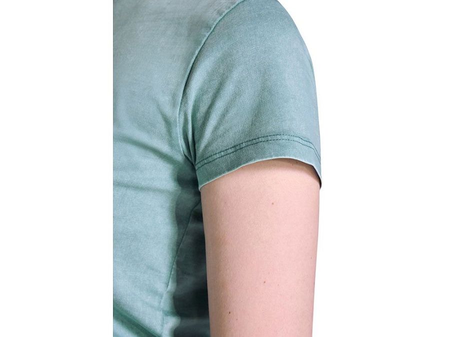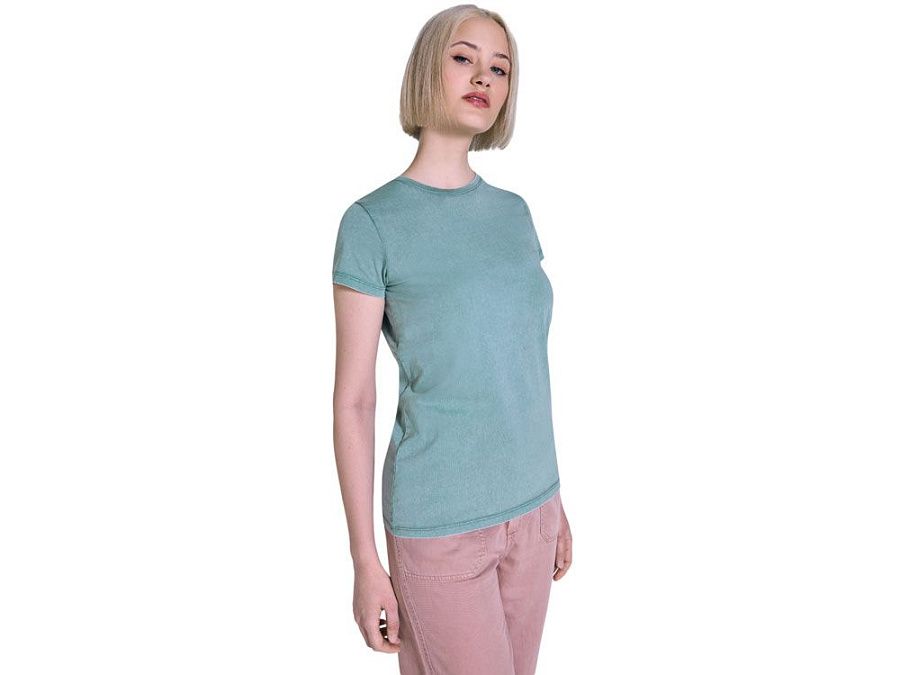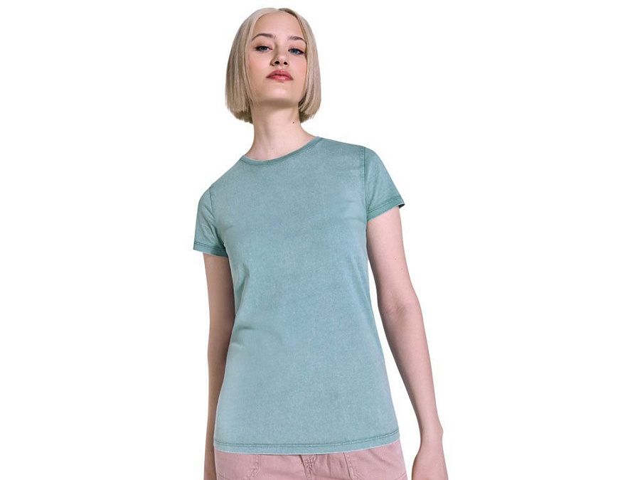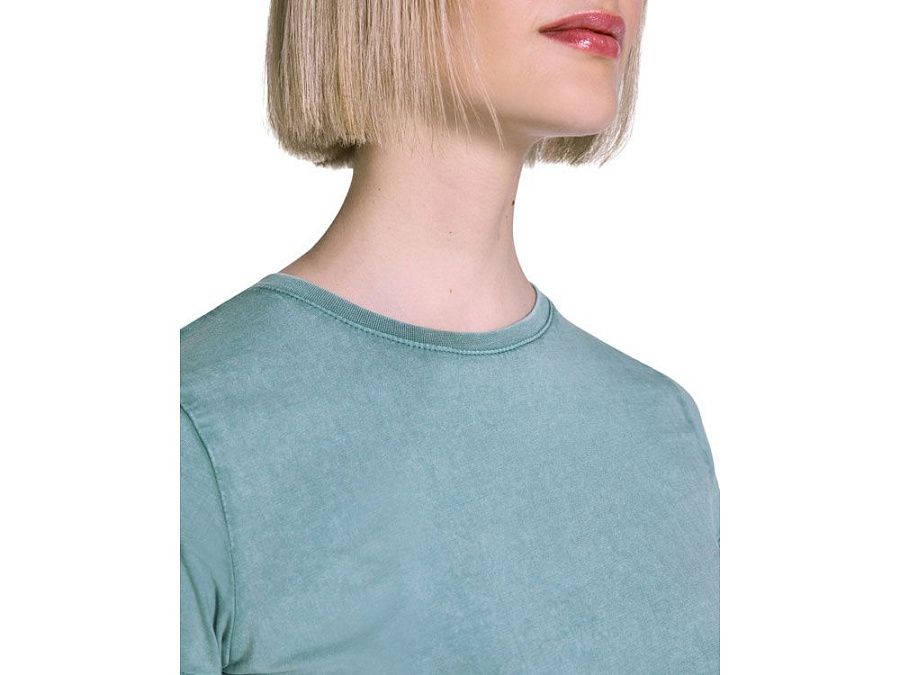 Женская футболка с коротким рукавом из 100% хлопка с аксидной стиркой. Круглый вырез горловины из риба 1х1. Отстрочка в тон по горловине.