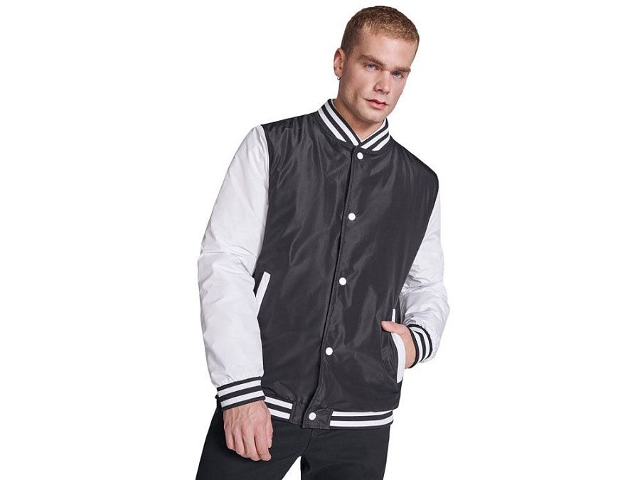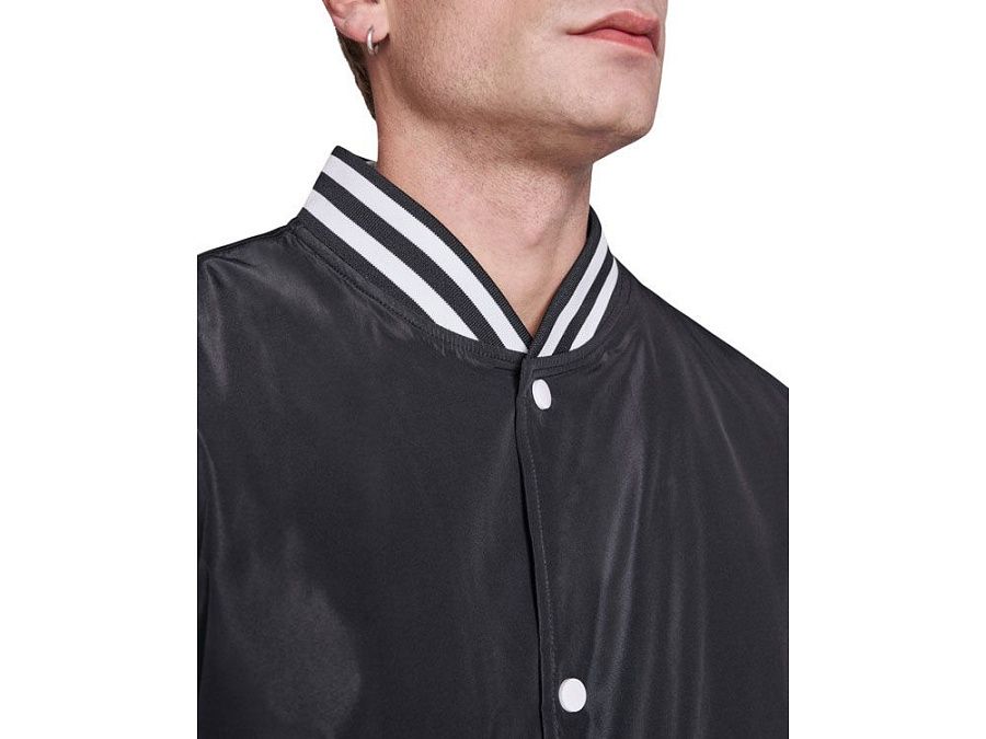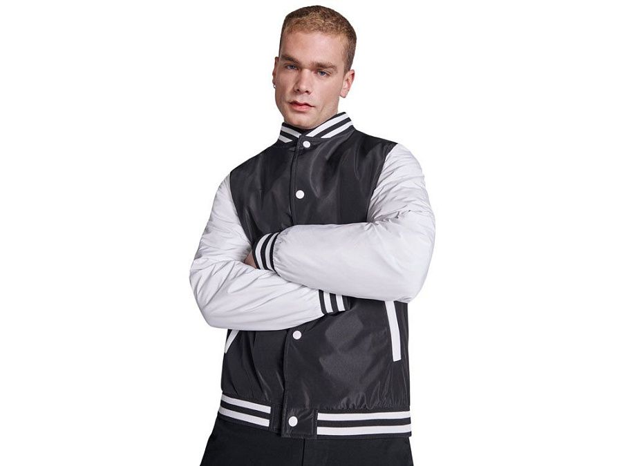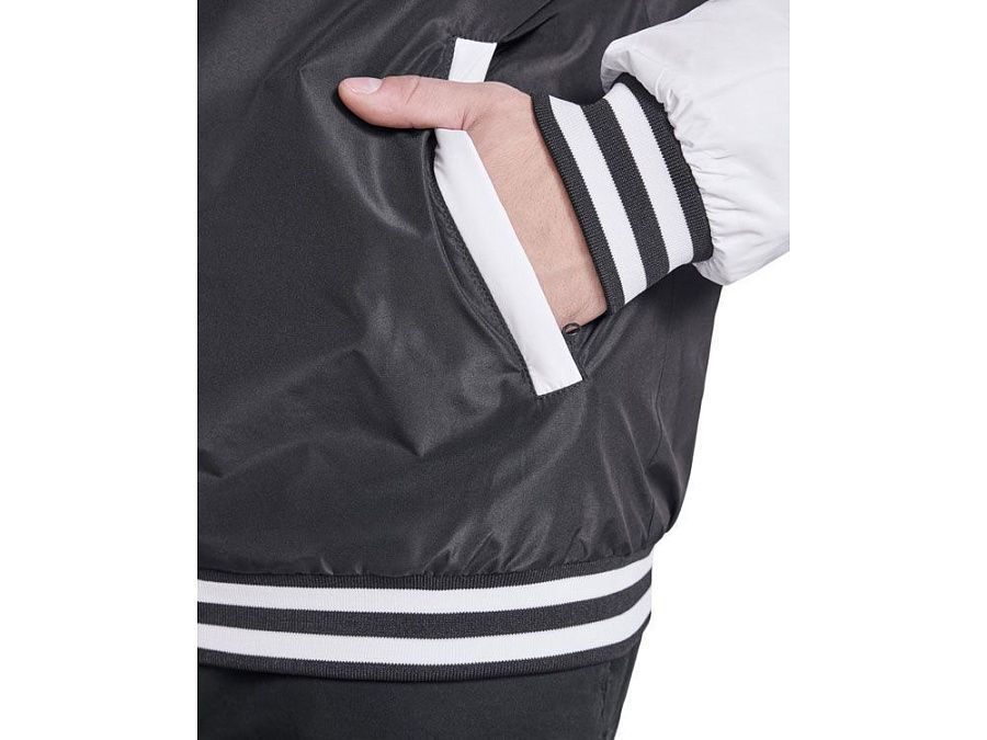 Утепленный бомбер колорблок из двух цветов. Воротник, манжеты и низ из риба 1х1 с двумя контрастными полосами. Боковые карманы закрываются на молнию. Контрастный кнопки.