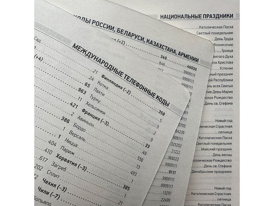 • справочная информация на 19 страницах (аэропорты Европы, штрихкоды, международные телефонные коды, цифровые автомобильные коды, энергетическая и питательная ценность продуктов, национальные и религиозные праздники, единицы измерения, страны мира, размеры одежды, форматы бумаги и др.);