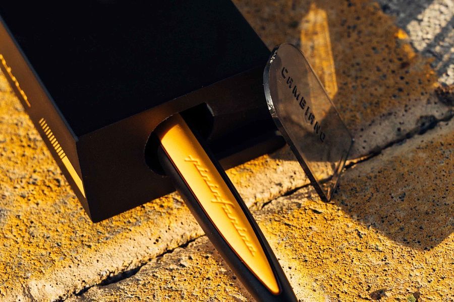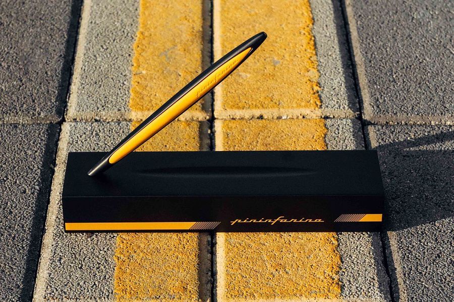 Флагманская ручка модели Cambiano Race Yellow дизайнерского дома Pininfarina сочетает в себе различные материалы, технологичность, элегантные линии и смелые дизайнерские решения. Она предназначена для тех, кто любит спортивный дизайн и стремится к уникальному опыту письма. Алюминиевый корпус ручки окрашен в черный цвет, а желтые эргономичные резиновые вставки мгновенно вызывают ассоциации с миром автоспорта и служат для оптимального захвата. Изысканная подставка из черного дерева, служащая одновременно коробкой для ручки, вручную покрыта черным лаком и позволяет превратить этот набор в уникальный арт-объект на вашем столе. Этот набор полностью изготовлен вручную, идеально воплощает итальянское мастерство, дух гонок и является символом высшего качества и эксклюзивности. Вечная ручка имеет необычный пишущий узел в виде наконечника Ethergraf, который изготовлен из сплава металлов по запатентованной технологии. Он не содержит свинец и алюминий, производится вручную итальянскими мастерами и практически не расходуется за десятилетия использования. При соприкосновении с поверхностью бумаги, происходит химическая реакция и наконечник оставляет серебристый след, который напоминает цвет графитового карандаша, но обладает большей стойкостью. Вес ручки 39 гр, длина 16 см.