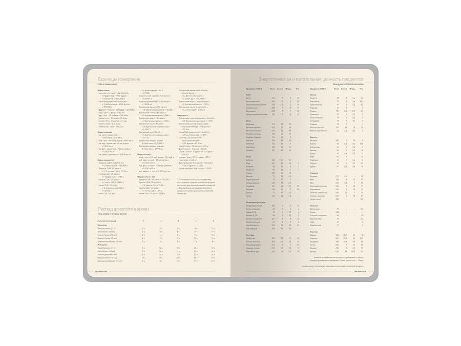 Внутренний блок выполнен из бежевой бумаги плотностью 70 г/кв.м и содержит 14 страниц справочной информации, а также датированные страницы с почасовой разметкой.