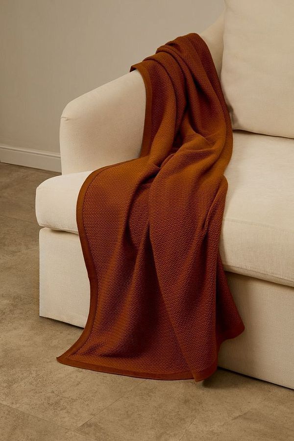 Плед из полушерстяной пряжи, поэтому прекрасно согревает и неприхотлив в уходе.