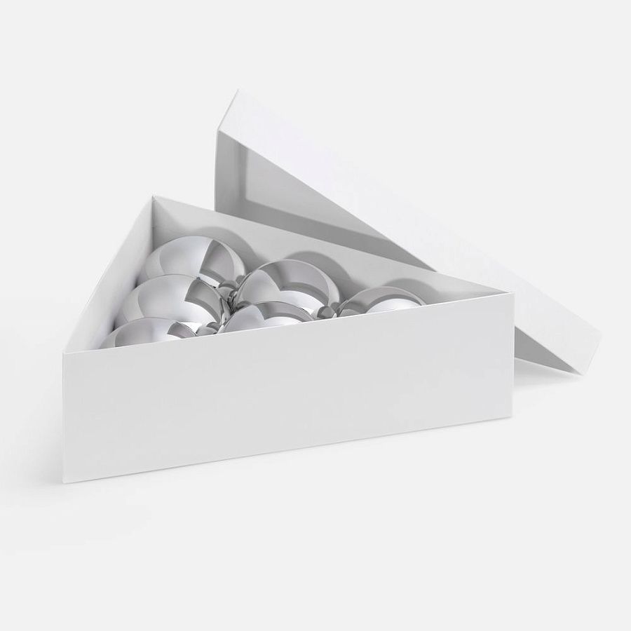 Трехгранная коробка Trigon прекрасно подходит для упаковки набора из 6 елочных шаров диаметром 10 см, а также других подарков нестандартной формы.