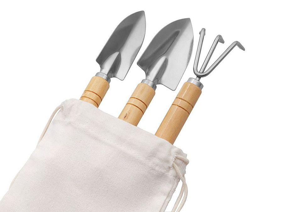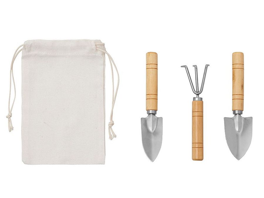 Садовый набор из 3 аксессуаров из нержавеющей стали с бамбуковыми ручками. Включает большую и малую лопатки и грабли. В комплект входит хлопковый мешочек.