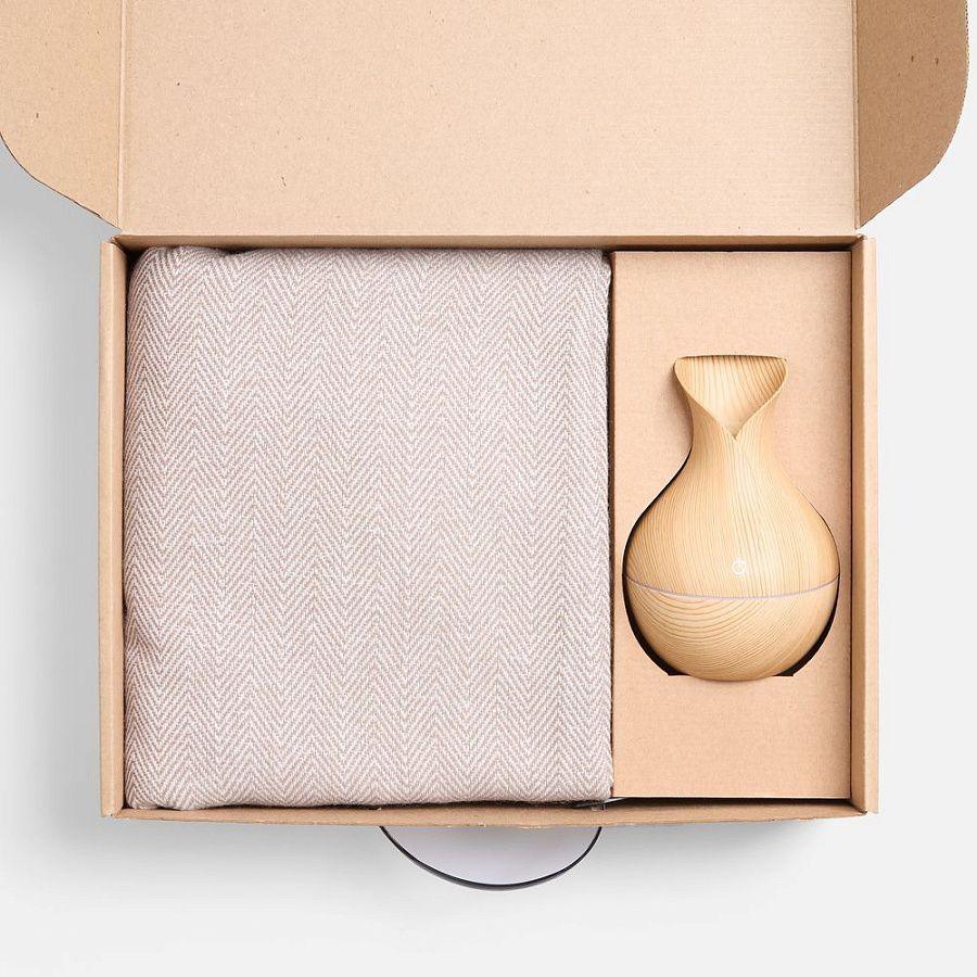 Мягкий плед нежных оттенков подарит тепло и комфорт, а изящный увлажнитель наполнит воздух свежестью и приятным ароматом. Этот набор — гармония красоты и функциональности, где каждый момент посвящен ценному отдыху и расслаблению.