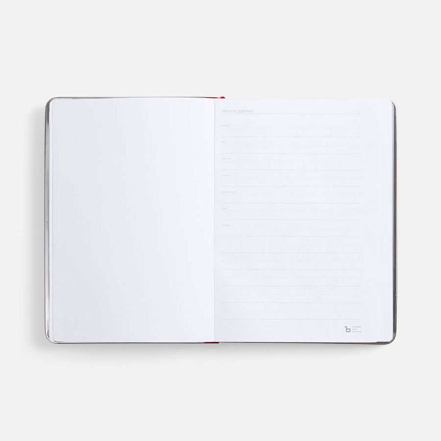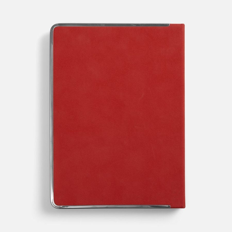 Ежедневник с твердой обложкой и серебристым обрезом блока. Выполнен из материала Nubuck, красный РР, дополнен красным ляссе и металлическими рамками с двух сторон обложки.