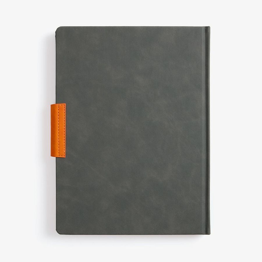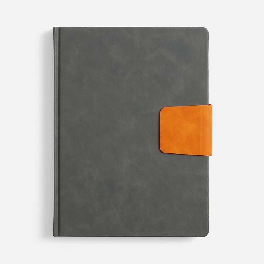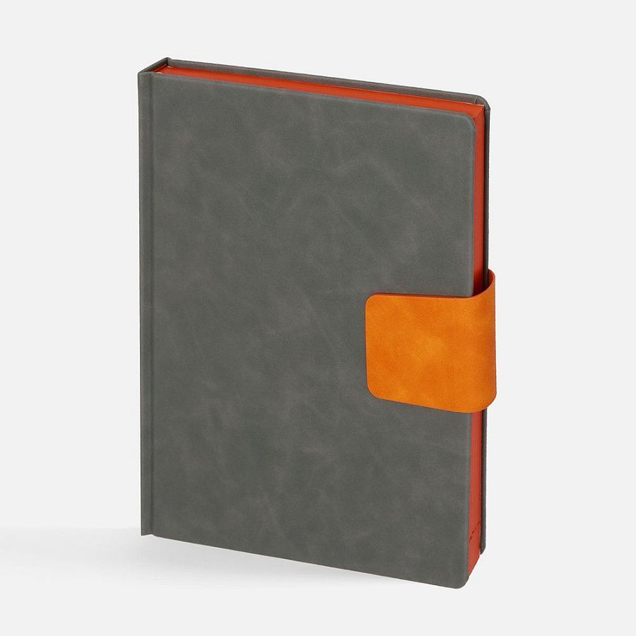 Ежедневник с твердой обложкой, выполнен из материала Nubuck Touch, темно-серый, дополнен капталом, ляссе и обрезом оранжевого цвета. Застежка — хлястик на магните из материала Nubuck Touch Ultra, оранжевый ОО.