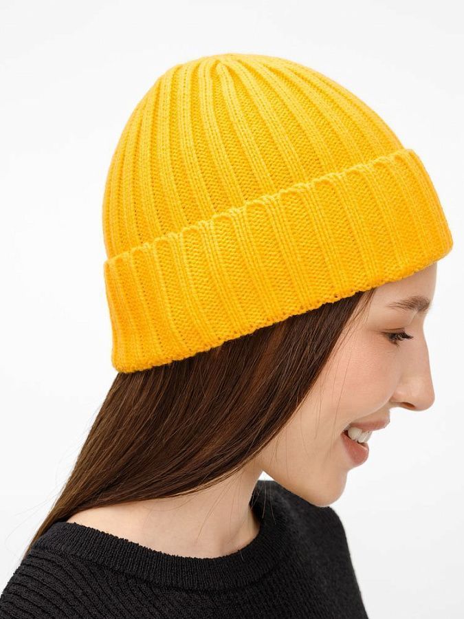 Однослойная шапка рельефной вязки с отворотом.