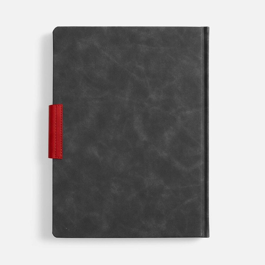 Ежедневник с твердой обложкой, выполнен из материала Nubuck Touch, черный АА, дополнен капталом, ляссе и обрезом красного цвета. Застежка — хлястик на магните из материала Nubuck Touch, красный РР.
