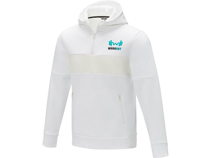 Молния на четверть длины. Модель анорак. Передние карманы с застежкой-молнией. Петля для подвешивания с фирменной символикой. Бегунки застежки-молнии с простой фиксацией. Главный лейбл нанесен методом термоприклеивания, удобным для размещения рисунков на ткани.