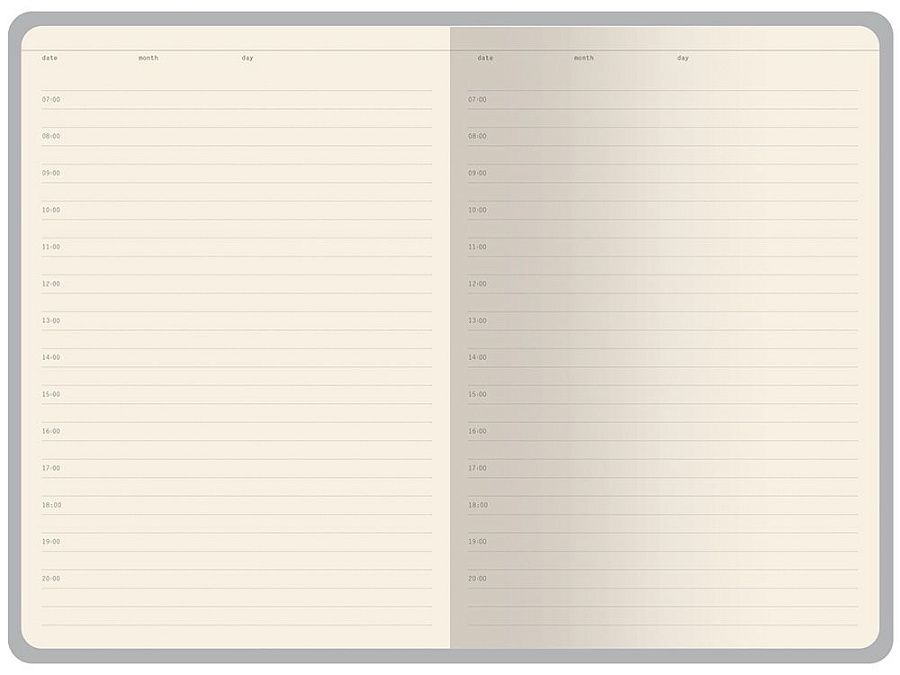 Бумажный блок, закрепленный книжным переплетом, выполнен из бежевой офсетной бумаги плотностью 70 г/ кв м. Внутри блока есть страница для персональных данных, справочная информация на 13 страницах. Блок для записей имеет линовку с указанием временных интервалов в один час.