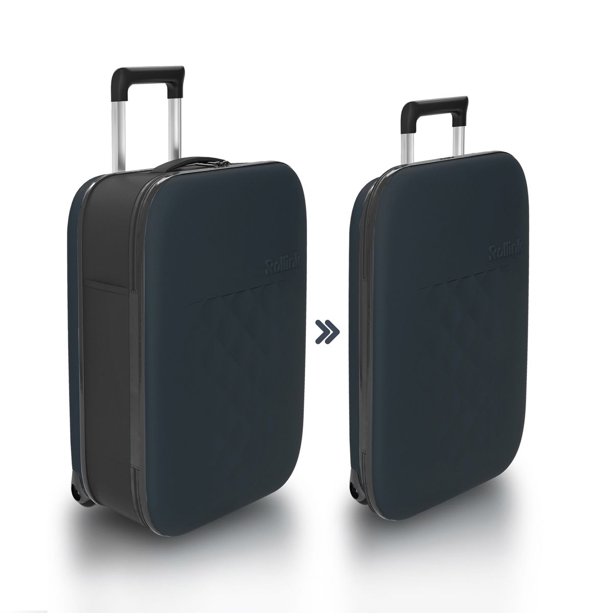 Складной легкий чемодан Rollink Vega II серо-синего цвета Atlantic Blue. Размер 55х40х20 см. В сложенном виде толщина составляет 5 см, с колёсами 8,5 см. Объем 40 л. Вес 2,4 кг. Жесткие стенки сделаны из поликарбоната повышенной ударопрочности. Бока мягкие, из темно-серого плотного полиэстера с высокой водоотталкивающей способностью. Чемодан уверенно стоит вертикально даже в сложенном состоянии. Внутри три откидывающихся жестких клапана на дне и боках чемодана, крепятся липучками и сохраняют форму чемодана в собранном виде. Эластичная Х-образная стяжка для фиксации предметов внутри чемодана. Боковой easy access карман 12х18,5 см на липучке для документов и телефона. Удлиненная надежная выдвижная телескопическая ручка из алюминия с несколькими уровнями фиксации высоты ручки (от пола 88/96/104 см) для людей разного роста и удобная мягкая ручка сверху чемодана, чтобы было удобно нести его в руках. 2 колеса со специальным покрытием и подшипниками для более плавного и бесшумного передвижения. Высококачественная молния черного цвета. В комплект входит эластичная стяжка для фиксации чемодана в сложенном состоянии.