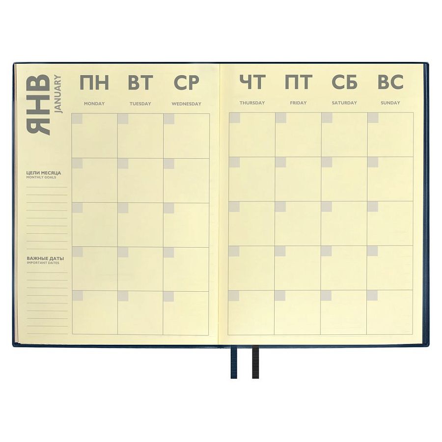На обложке встречается оттиск от закладки, который разгладится в процессе эксплуатации ежедневника.