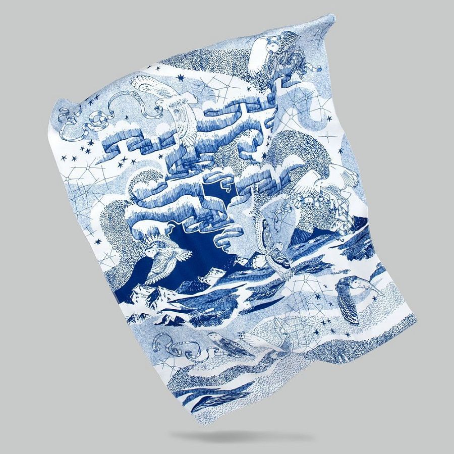 Бескрайний простор Севера, горный пейзаж, созвездия и всполохи Северного сияния в окружении вереницы мудрых сов — настоящая магия происходит на пледе «Чудеса прилетели»! Чудеса эти несут в себе отдельные смыслы: у совушек в клювах длинные листочки с пожеланиями и заветами на будущий год.