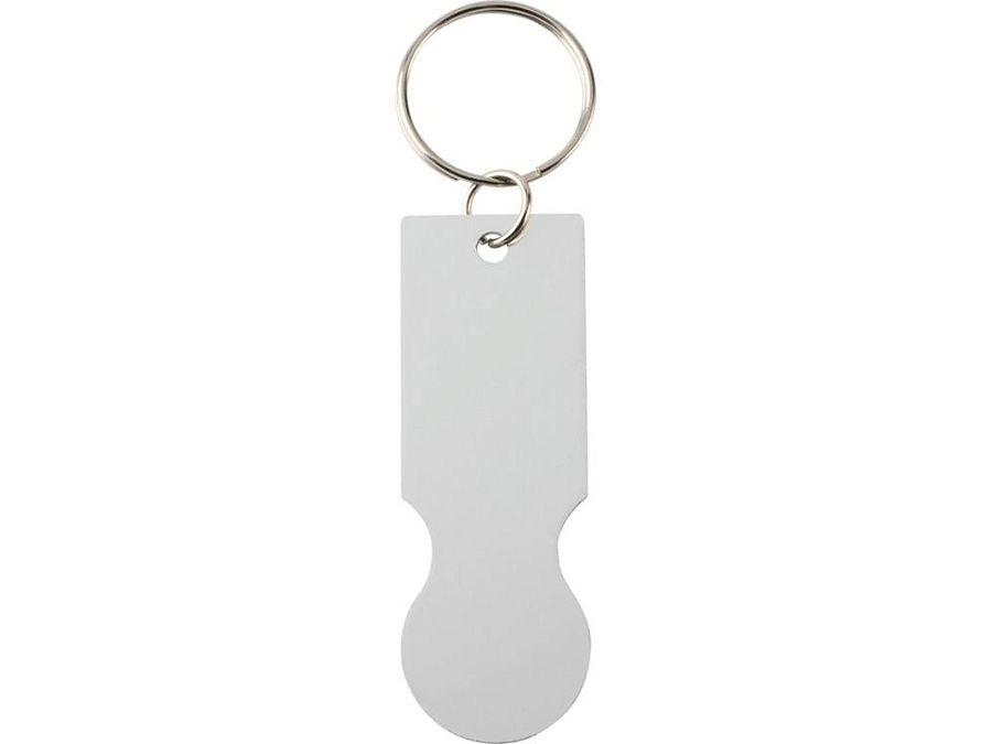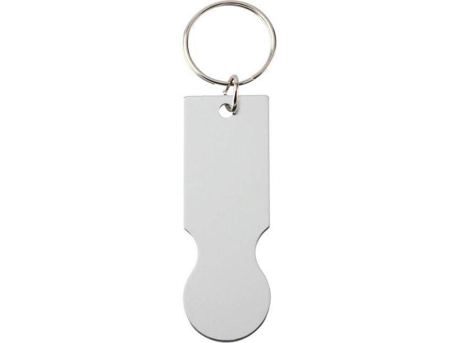 Металлический брелок для ключей Rhea с монетой для тележки предназначен для большинства тележек супермаркетов, позволяя открывать их без монет или жетонов. Сделан из переработанного алюминия.