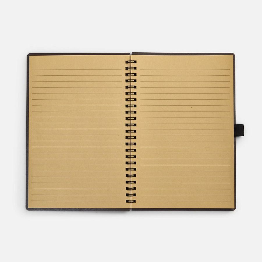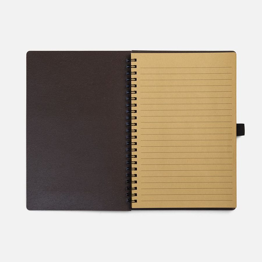 Блокнот на спирали из пластика и кофейного жмыха, дополнен резинкой для ручки.