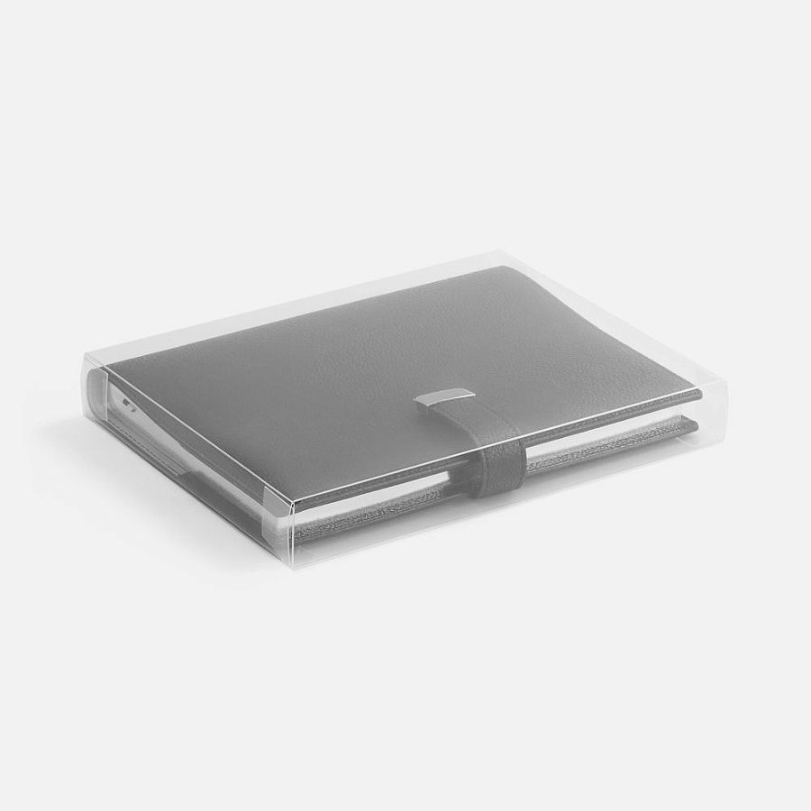 Ежедневник в мягком переплете со съемной обложкой, дополнен застежкой-хлястиком с металлическим шильдом на кнопке, двойным ляссе и капталом.