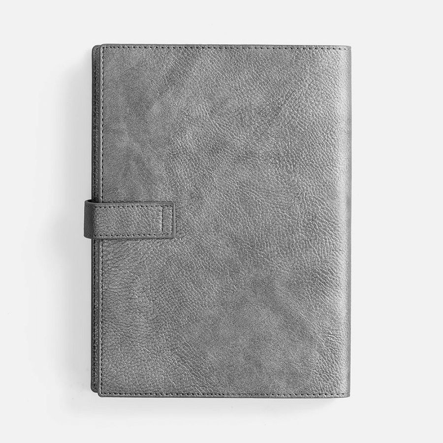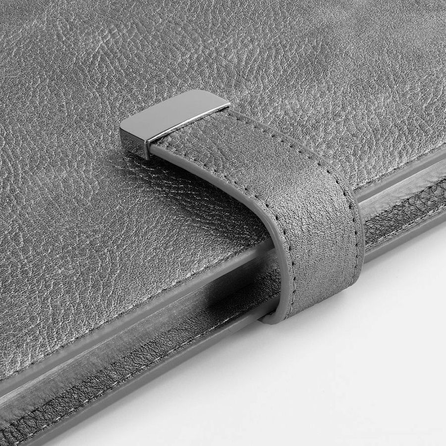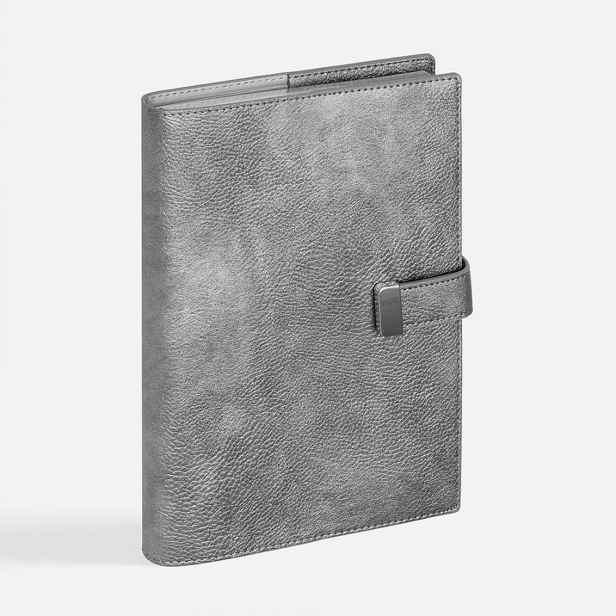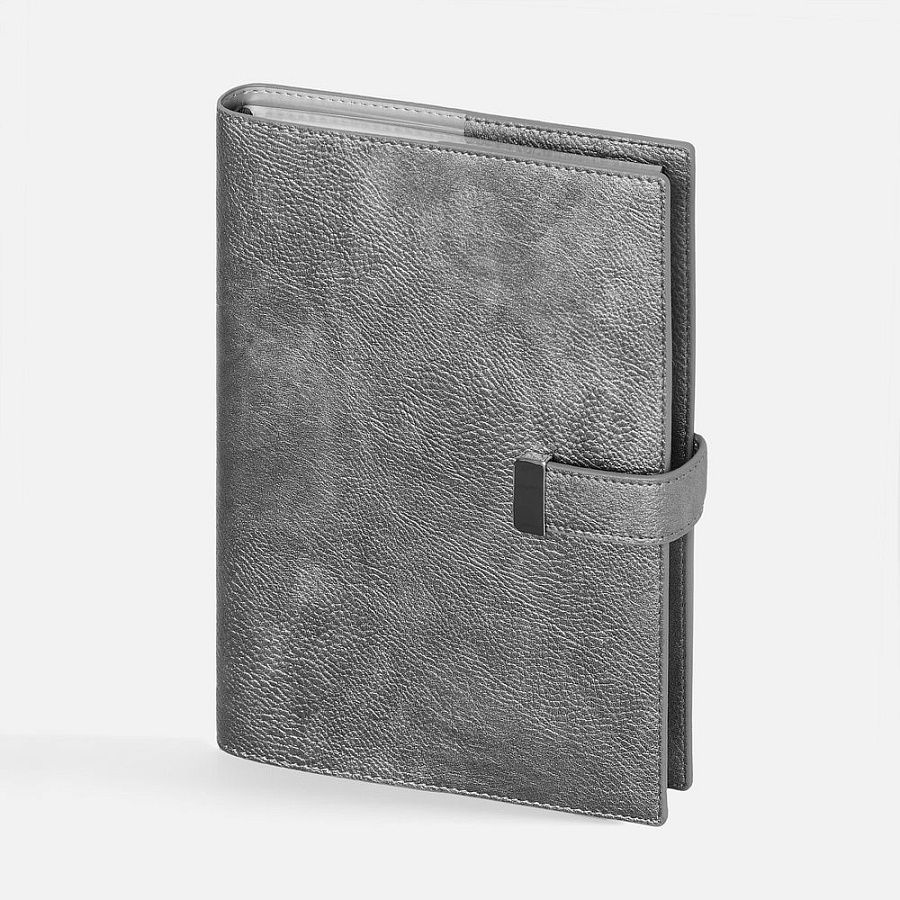 Ежедневник в мягком переплете со съемной обложкой, дополнен застежкой-хлястиком с металлическим шильдом на кнопке, двойным ляссе и капталом.