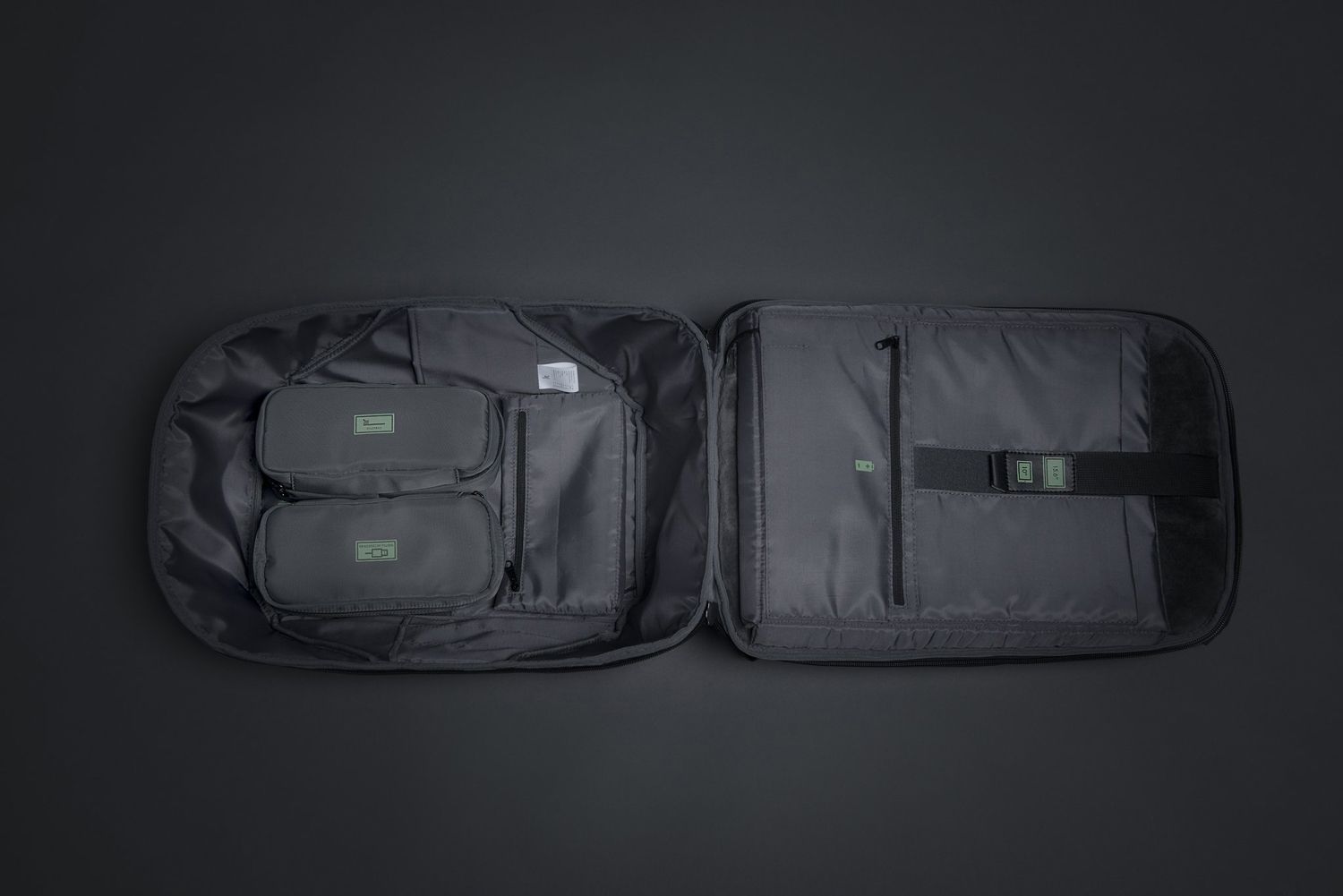 Конструкция рюкзака позволяет раскрыть его на 180°, чтобы аккуратно уложить в рюкзак много различных предметов. Дополнительно в основном отделении расположены еще 9 карманов различного функционала. 7 открытых карманов под мелочи, 2 кармана на молниях, в который можно поместить powerbank, т к в него приходит USB-кабель (600 мм, 0,5-0,7 А, 5В), соединенный с портом на внешней стороне рюкзака для легкого подключения к смартфону. Это оригинальная запатентованная система зарядки K EasyCharging 1.0 с помощью USB-порта, расположенного в борту рюкзака, и кабеля, идущего к powerbank, что делает мобильную зарядку более удобной.