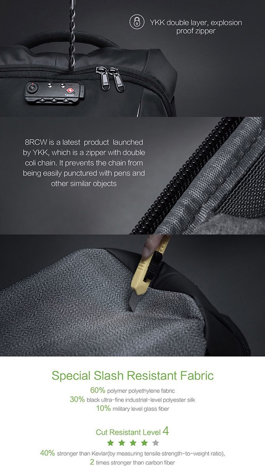 • Молния YKK с фиксацией кодового замка TSA007 с функцией таможенного досмотра.