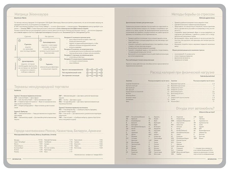 Недатированные страницы в серую линейку имеют отдельное место для проставления числа месяца и дня недели. Справочный блок на 17 страницах содержит полезную информацию из различных областей.