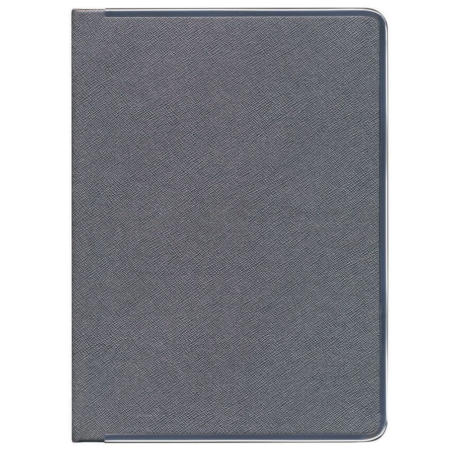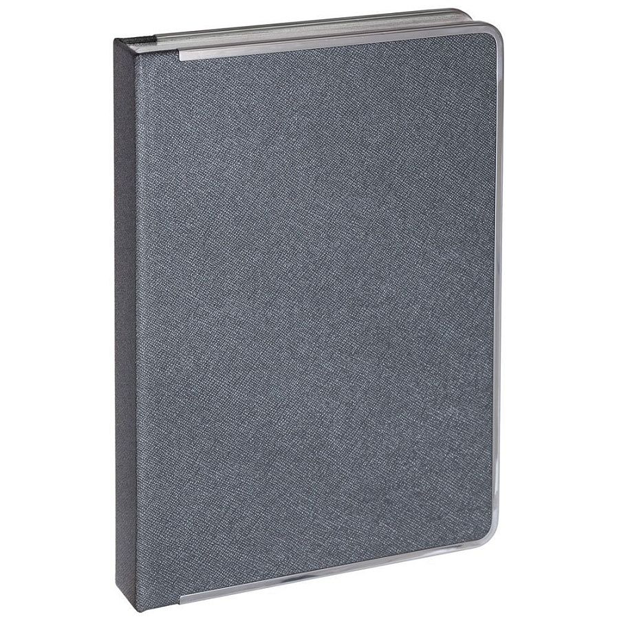 Ежедневник с твердой обложкой и серебристым обрезом, выполнен из материала Saffian, темно-серый, дополнен серым ляссе и металлическими рамками.